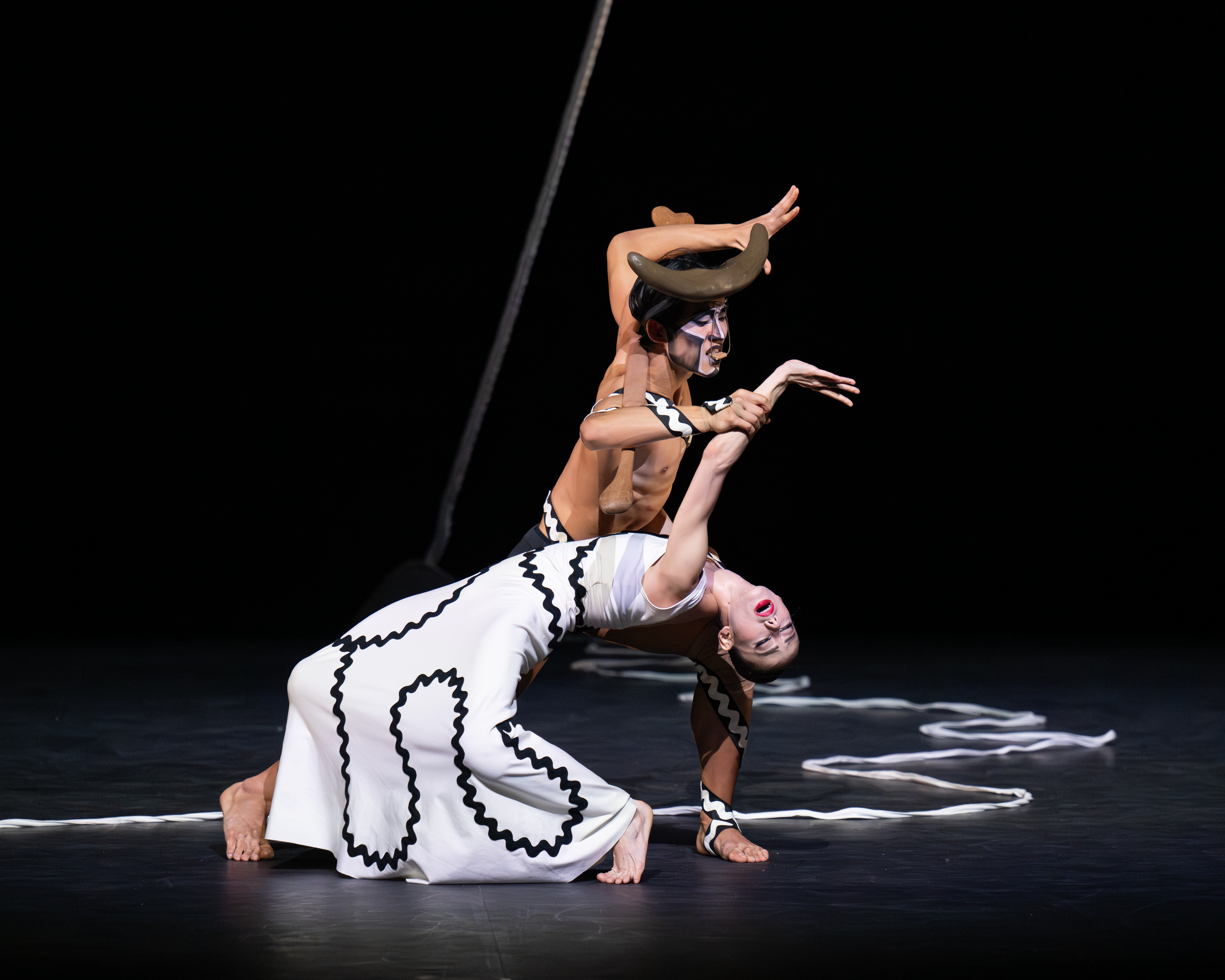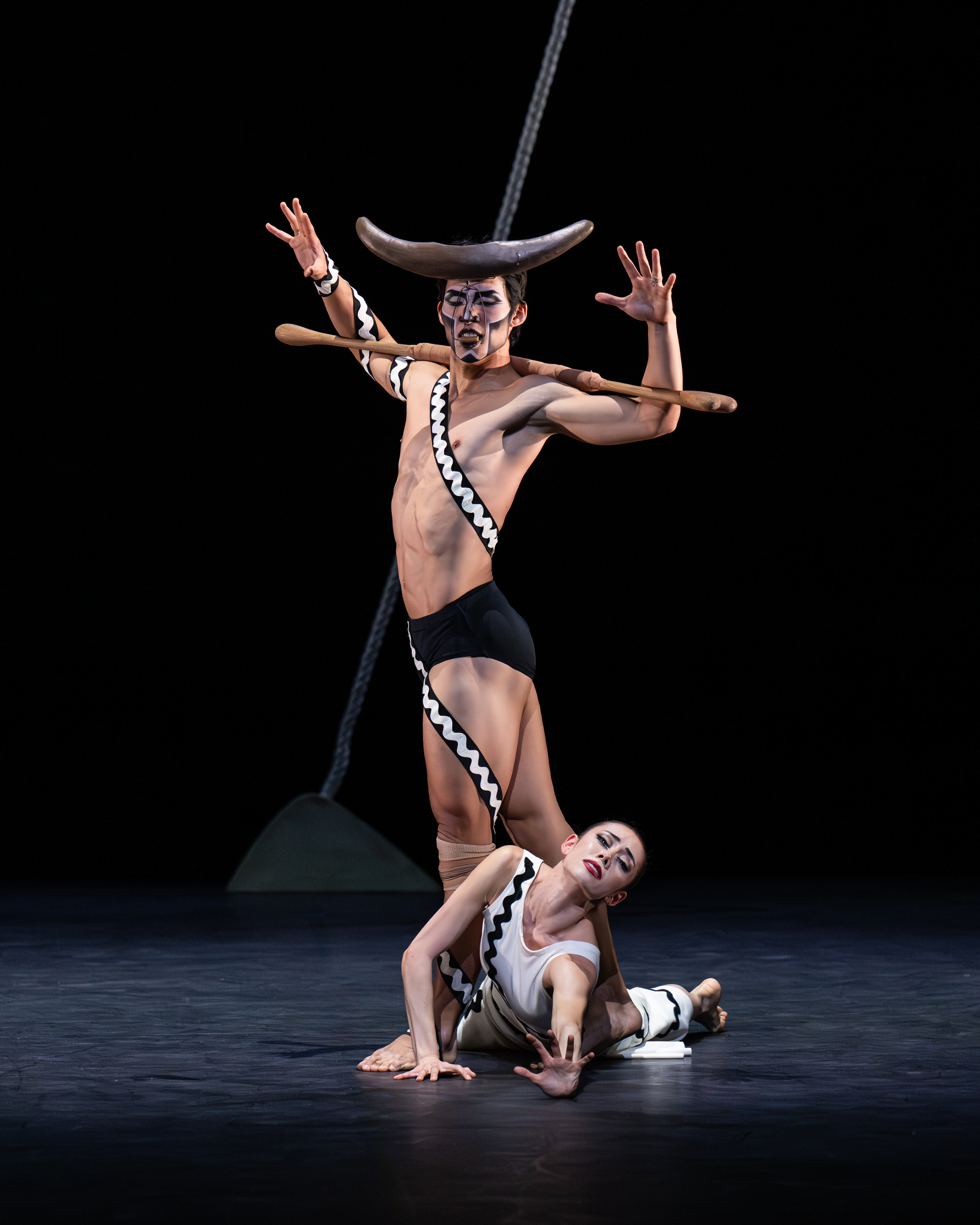 In the original Noguchi costume, the headdress masked the dancer’s face entirely while later productions replaced this with a golden horned headdress.