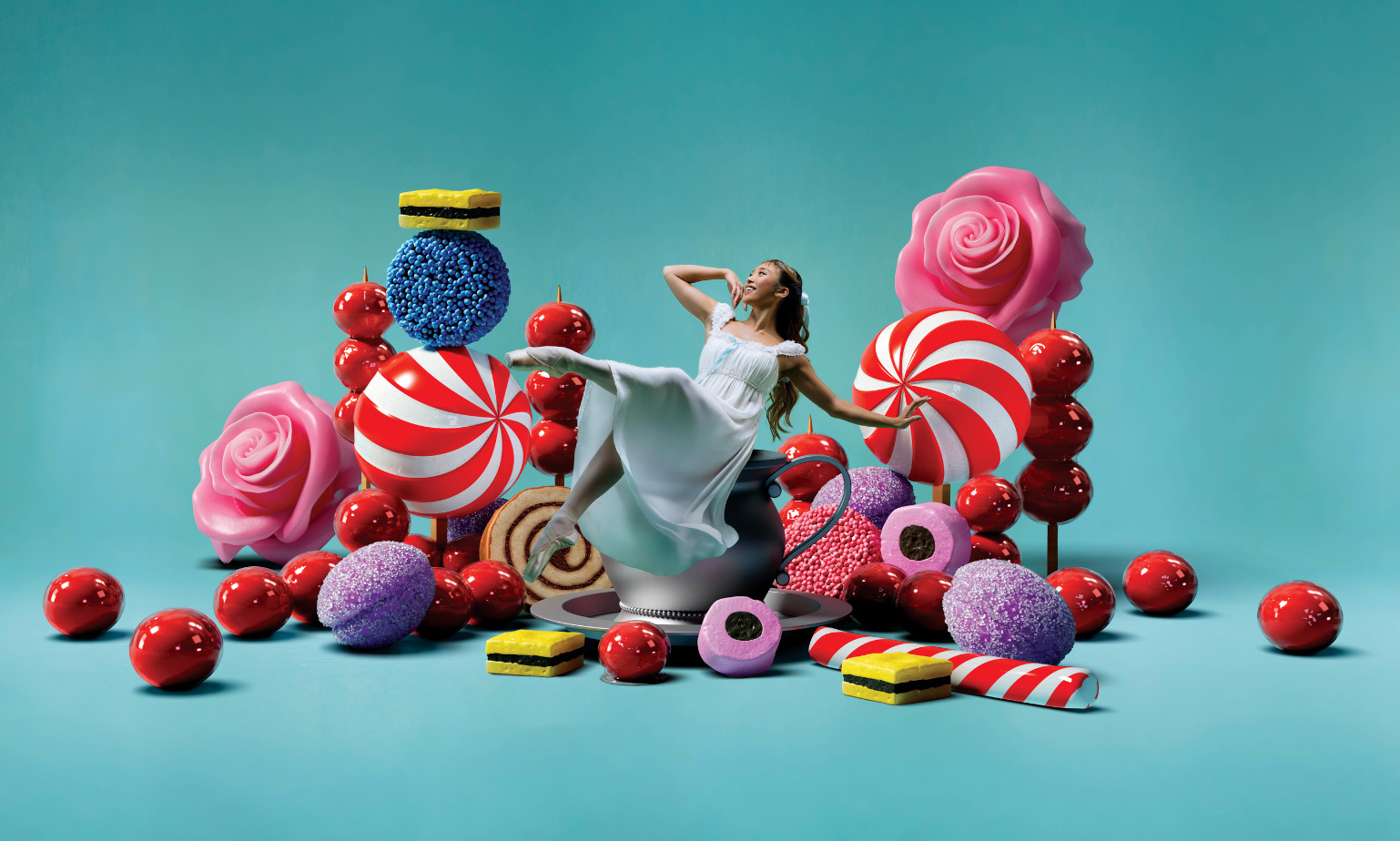 The striking designs by Sue Blane presented the dancers dressed in chic black outfits for the party set in a Belgravia home. The sweets in Act II were immediately recognisable as Smarties and Liquorice Allsorts.