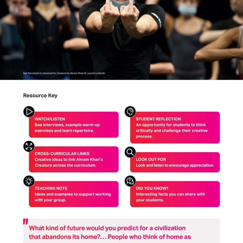 Exploring the themes and concepts of Akram Khan’s Creature, this schools pack (supplied as an interactive PDF*) provides a multitude of valuable insights and creative tasks perfect for KS3, KS4 and BTEC students.