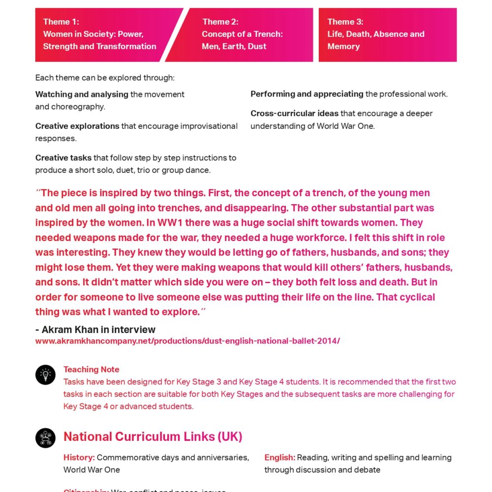 Exploring the themes and concepts of Akram Khan’s Dust, this digital resource pack provides a multitude of valuable insights and creative tasks perfect for KS3, KS4 and BTEC students.