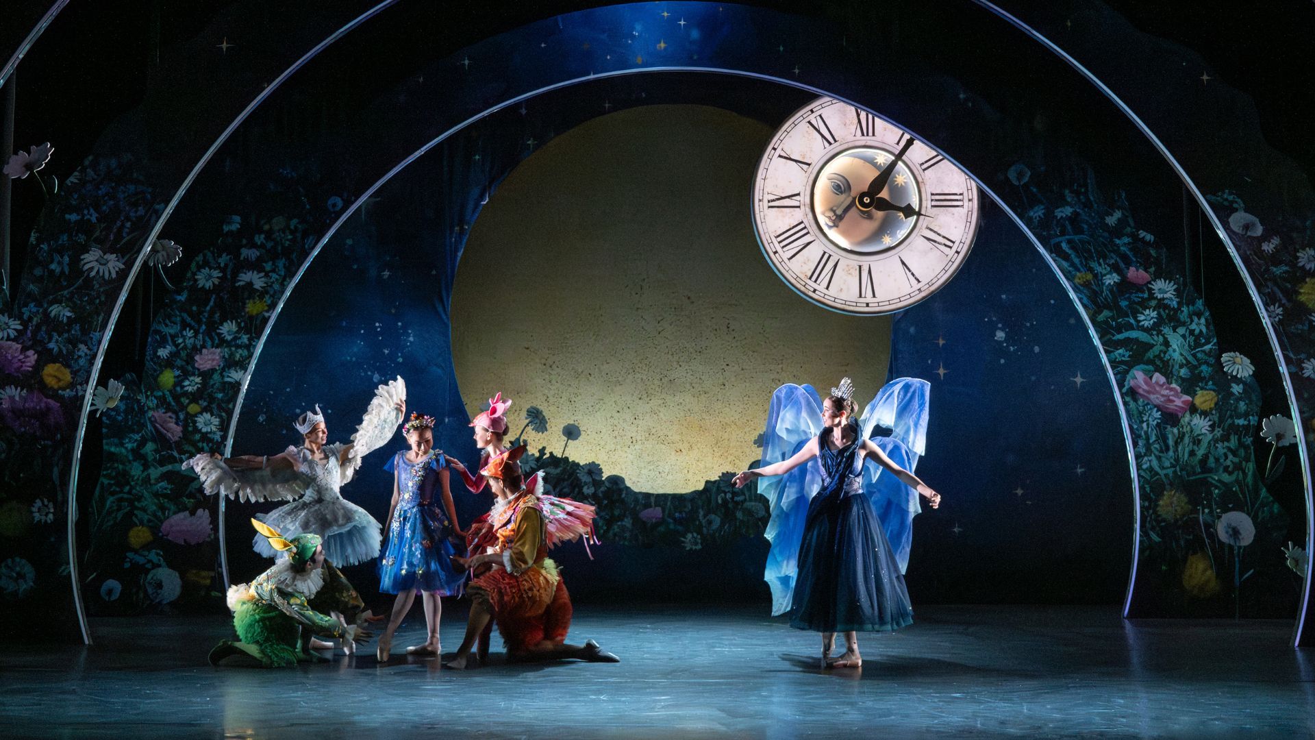 The Scarecrow comes to life, joined by animals from the nearby forest: Spring Hare, Summer Stag, Autumn Fox and Winter Owl. With their help and a touch of Fairy Godmother magic, Ella is transformed. She is dressed in flowers, leaves, and living things, and carried to the ball in a magical carriage. The Fairy Godmother gently warns her that the magic will last only until midnight.